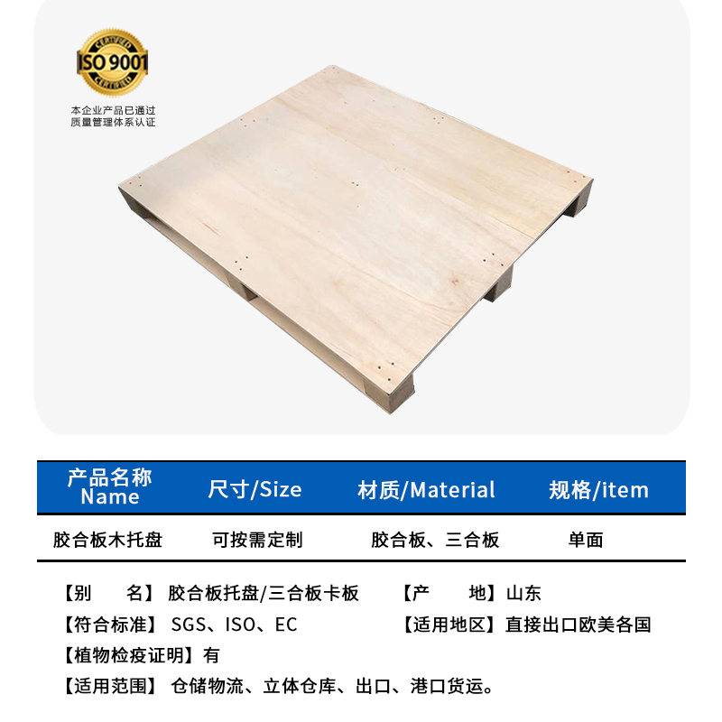 免熏蒸木托盤是采用膠合板制作(膠合板屬于人造板類材料又叫三合板、復(fù)合板等),均選用厚度10~18mm的板材做為托盤原料,堅(jiān)固耐用,除可生產(chǎn)符合各國標(biāo)準(zhǔn)的產(chǎn)品外,也可根據(jù)用戶需求訂做各種尺寸托盤。