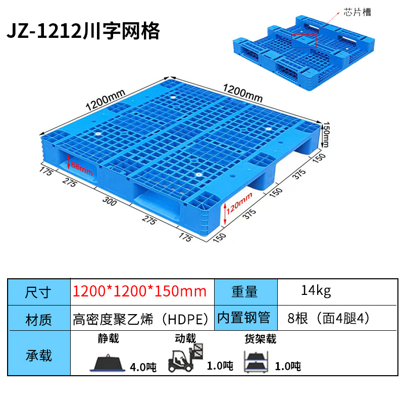 托盤設(shè)有RFID芯片槽位置,可插電子芯片,高效管理貨物,是智能倉(cāng)儲(chǔ)、物流電商、立體貨架等行業(yè)的得力助手